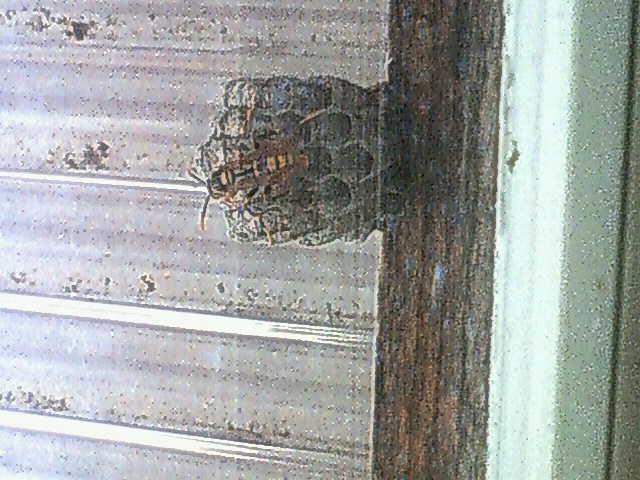 家の軒先に蜂が巣を作り出しました。 見づらいですが一匹だけ留守番してる様子。