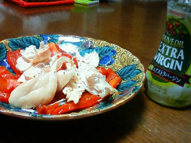 昨日テレビでやってたやつ。ささみと焼いて皮を剥いたパプリカ。ポン酢とオリーブオイルかけて食べます。パプリカすごい甘くてうまかった!