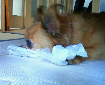 スーパーのレジ袋を結んだもので遊ぶモモさん。